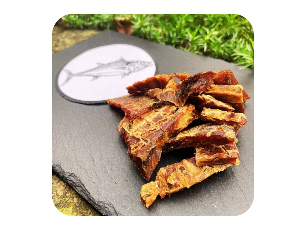 Složení: 100% sušené maso z tuňáka.