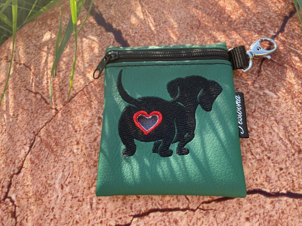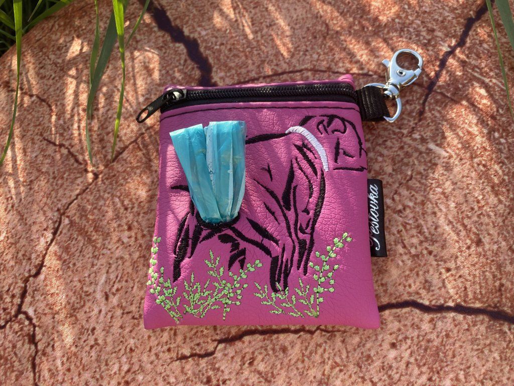 Je ušitý kvalitní koženky, lze ho karabinkou zavěsit na batoh, tašku, klíče nebo vodítko... Zkrátka tam, kde ho potřebujete mít. Zapínání na přední straně na zip. Sáčky se vytahují vyšitou dírkou na přední straně.